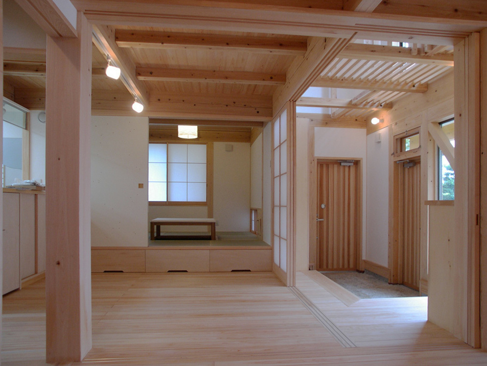 この家のポイント、南に面した明るい土間玄関です. 打合せの中でプランは色々と変わりましたが、最後まで残ったのがこの土間玄関と家の中心にある7寸(21cm)角の通し大黒柱です。構造体は2間 (3.6m)角の正方形の空間が4つ集まって構成される田の字型のフレームとその中心にある通し大黒柱で構成されています. シンプルな構成ですが、居間、食堂、土間玄関は障子のパーティションで仕切られ、それぞれにもワンルームにもその姿を変える事が出来るようにしており多様な使い方を可能としています。