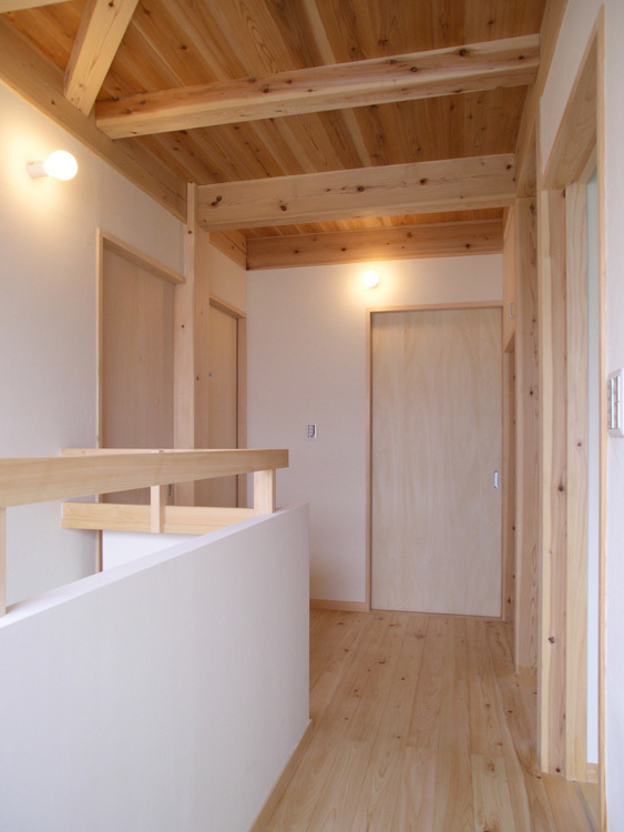 大黒柱を中心として南西側の居間、東側の食堂・和室、南東側の明るい土間玄関、北西側が水廻り及び階段、北東側が台所とわかりやすいシンプルなプランです。シンプルですが障子パーティションの扱いによってそれぞれに分けたり、あるいは連読させたりと変化にとんだ多様な使い方が可能なように工夫しています。